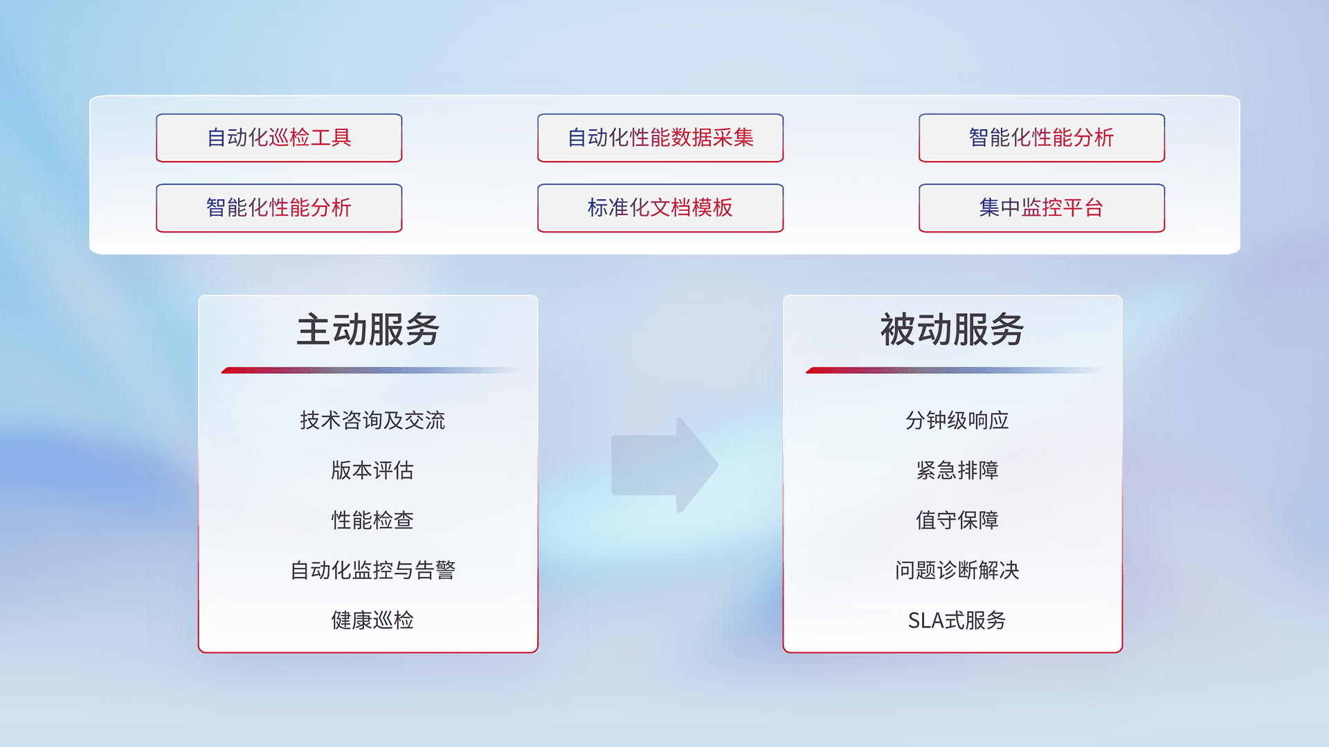 智能化工具和标准化文档,,,保障服务质量,,提供主动服务(包含技术咨询、、、版本评估、、、性能检查、、、、自动化监控与告警、、健康巡检)和被动服务包含(分钟级响应、、紧急排障、、、、值守保障、、、问题诊断解决、、、、SLA服务)。。。